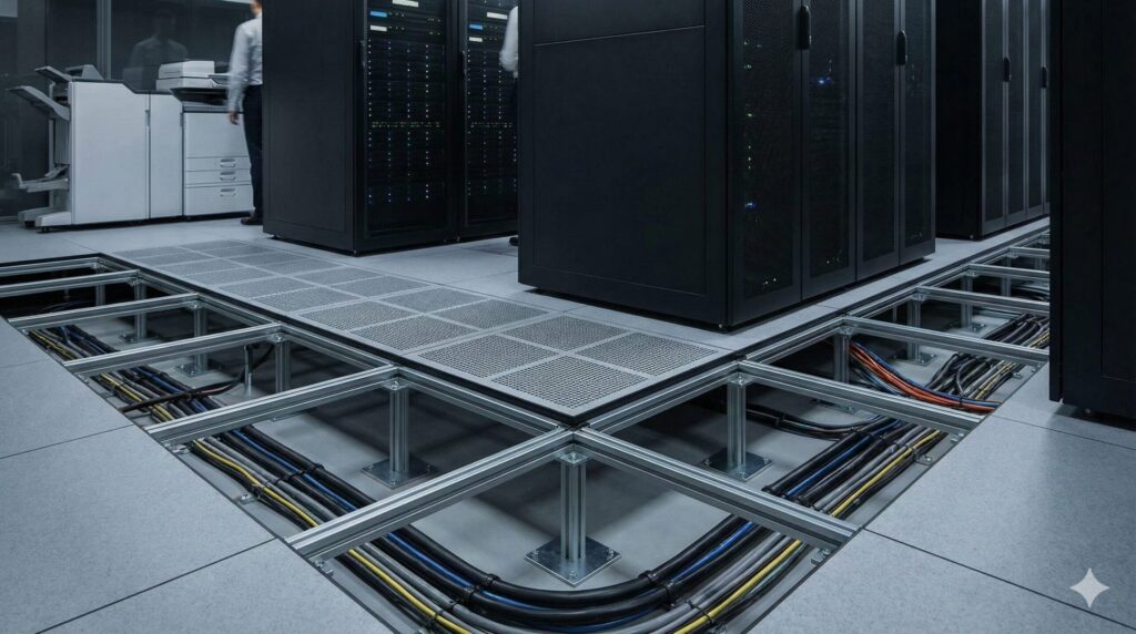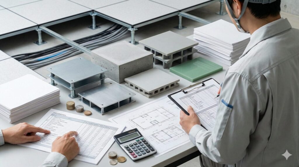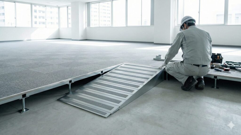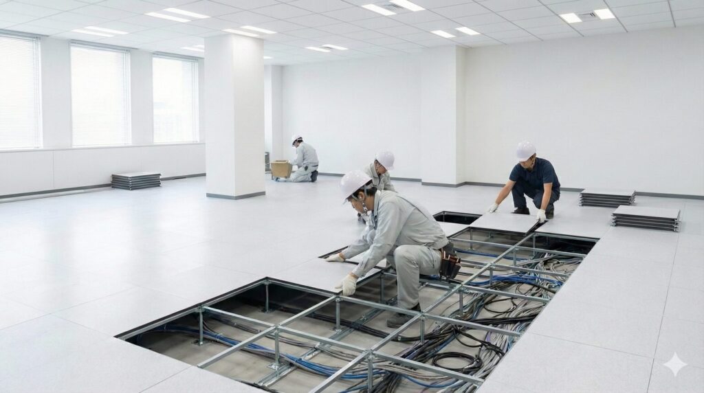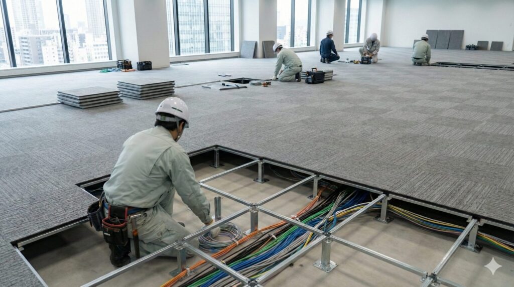 配線管理、高さ調整可能なオフィス向け床工事